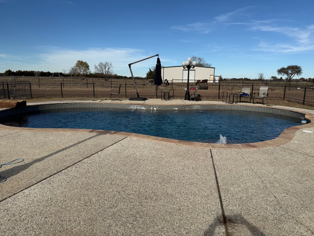 The conveniences of home and the luxury of a hotel. Whether you are here for work, visiting family, taking a vacation, or needing to be near Dallas, our goal is for you to have the best Airbnb experience ever! Near downtown Ennis and 45 minutes to DFW, this new one-bedroom guest cottage includes a fully equipped kitchen and bathroom, living room with smart TV, office space, laundry room, and attached garage! With full use of seasonal pool, jacuzzi, gym, grill, fire pit, and outdoor amenities!