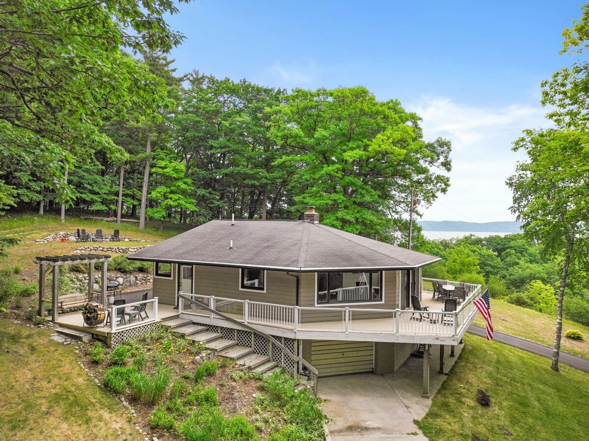Neobično na sjevernoj brvnari lijepo smještenoj na privatnom vrhu brda sa zadivljujućim pogledom na jezero. Besprijekorno s visokim stropovima, otvorenim tlocrtom i pultovima čvrstih površina. Apartman u glavnoj spavaćoj sobi na glavnom spratu s pogledom na blistavo plave vode jezera Lime. Prednji trijem i natkrivena terasa uz jezero za uživanje u prirodi i predivnom pogledu na vodu. Privatna prednja strana preko ulice s NOVIM pristaništem, ognjištem i prostorom za piknik. Čista, prelijepa Leelanau u najboljem svjetlu! 39 min. do skijališta Crystal Mt.!