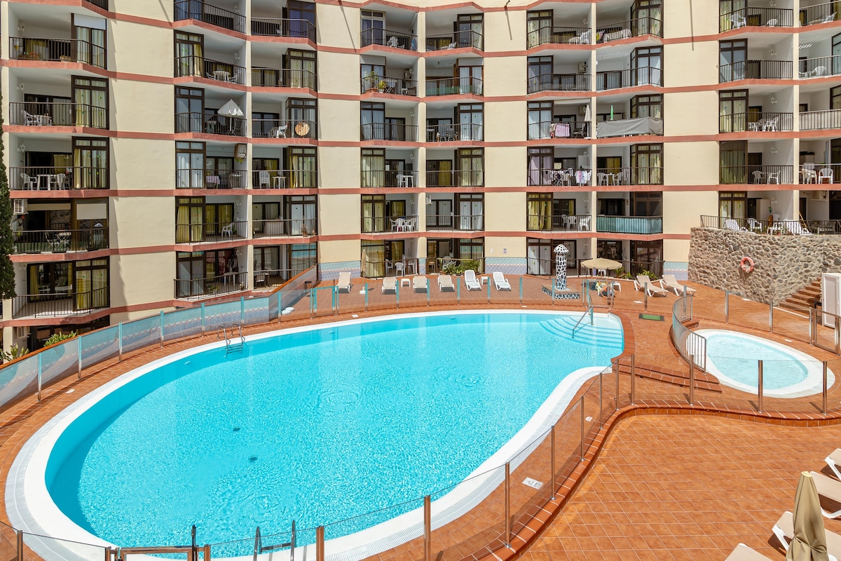 Cosy accommodation with climatisation on TOP LOCATION in a quite complex with a big HEATED(!) swimming pool. Central location: 500 meter from the beach/Yumbo/Cita. Quiet one way street with free parking. Check-in only after 18h! Spacious South/West balcony with lounge sofa and "All Fresco" dining table for 4 guests. American full equiped kitchen with basic cooking supplies, airfryer and coffee corner. Smart TV with chromecast. Bright and spacious bathroom. Two comfortable 2 persons bedrooms.