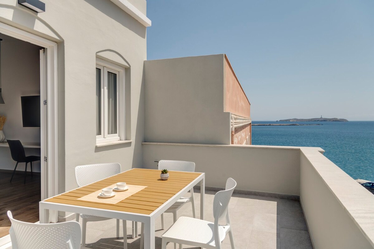 Fully equipped one-bedroom apartment with frontal sea view. One double bed in the bedroom, fully equipped kitchen (oven, fridge-freezer, dishwasher, 4-pits), bathroom with bathtub , washing machine, private terrace with chairs and table. Access to a shared patio with direct access to the sea (rocks) where the guests can take a morning swim. Frontal sea view from living and bedroom. A few steps from the center of Ermoupolis.