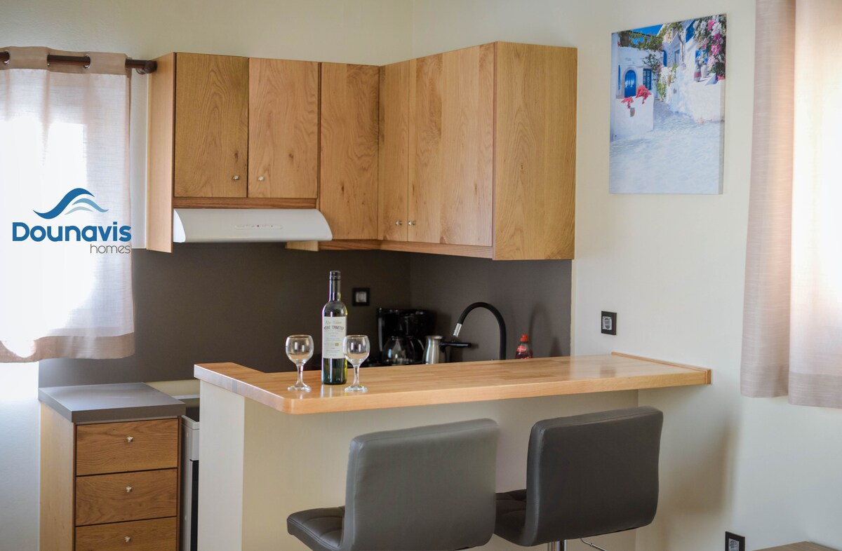 Fully equipped one-bedroom apartment with frontal sea view. One double bed in the bedroom, fully equipped kitchen (oven, fridge-freezer, dishwasher, 4-pits), bathroom with bathtub , washing machine, private terrace with chairs and table. Access to a shared patio with direct access to the sea (rocks) where the guests can take a morning swim. Frontal sea view from living and bedroom. A few steps from the center of Ermoupolis.