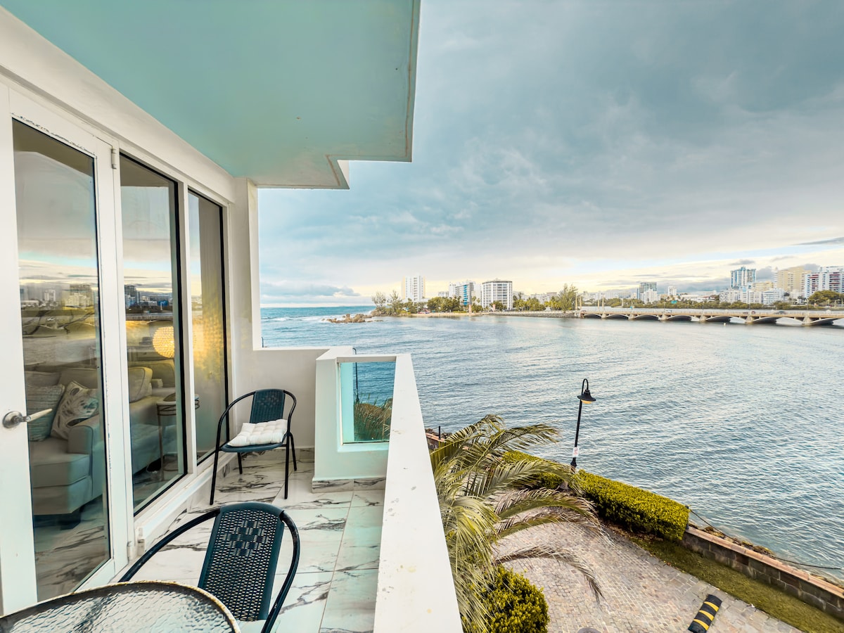 Boravite u modernom apartmanu na prvom spratu, samo nekoliko koraka od bazena. Uživajte u udobnom bračnom krevetu, privatnoj terasi i prekrasnom pogledu na okean i historijsku tvrđavu San Gerónimo. Ovaj udoban prostor spaja udobnost i praktičnost, nudeći jednostavan pristup laguni, obližnjim restoranima i najboljim atrakcijama ovog područja, što je savršeno za opuštanje ili istraživanje San Juana.