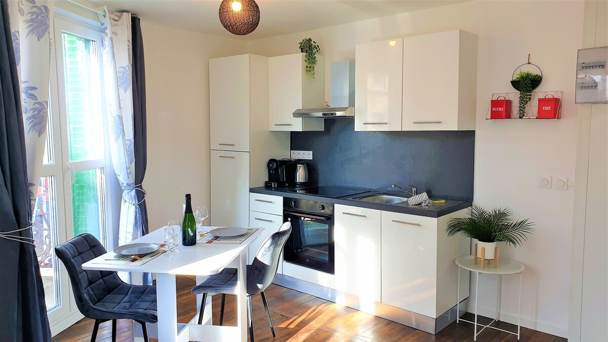 Jolie maison rénovée dans un quartier calme à 10 minutes à pied de la gare,proche de toutes commodités. Elle comprend une cuisine équipée,un salon- salle à manger(canapé convertible 2 places),2 chambres lit double et une salle d eau-wc. Sur demande, équipements bébé. Le ménage doit être effectué avant votre départ,tout le nécessaire est dans le placard. Tarifs à la nuitée: De 1 à 4 personnes : A partir de 70 euros. De 5 à 6 personnes: Un supplément de 30 euros par personne est demandé.