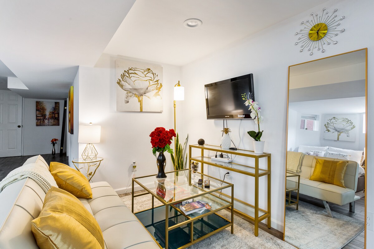 **MJESEČNI BORAVAK JE DOBRODOŠAO** Ovaj veliki studio PRIHVATLJIV ZA KUĆNE LJUBIMCE u prizemlju/podrumu nudi čist, udoban prostor, spa kupatilo, kuhinju, pametni TV i dovoljno prostora u ormaru. Također dolazi s OGROMNIM dvorištem opremljenim visećom ležaljkom, logorskom vatrom i prostorima za objedovanje/odmor. Dostupne su i usluge za klijente (pogledajte svoju knjigu dobrodošlice nakon rezervacije). Besplatno privatno parking mjesto, jednostavan dolazak, 30 minuta do New Yorka; 7 minuta do popularnih mjesta. Rani/kasni dolazak/odlazak: 70 USD svaki. Naknada za kućne ljubimce: 100 $ po kućnom ljubimcu.