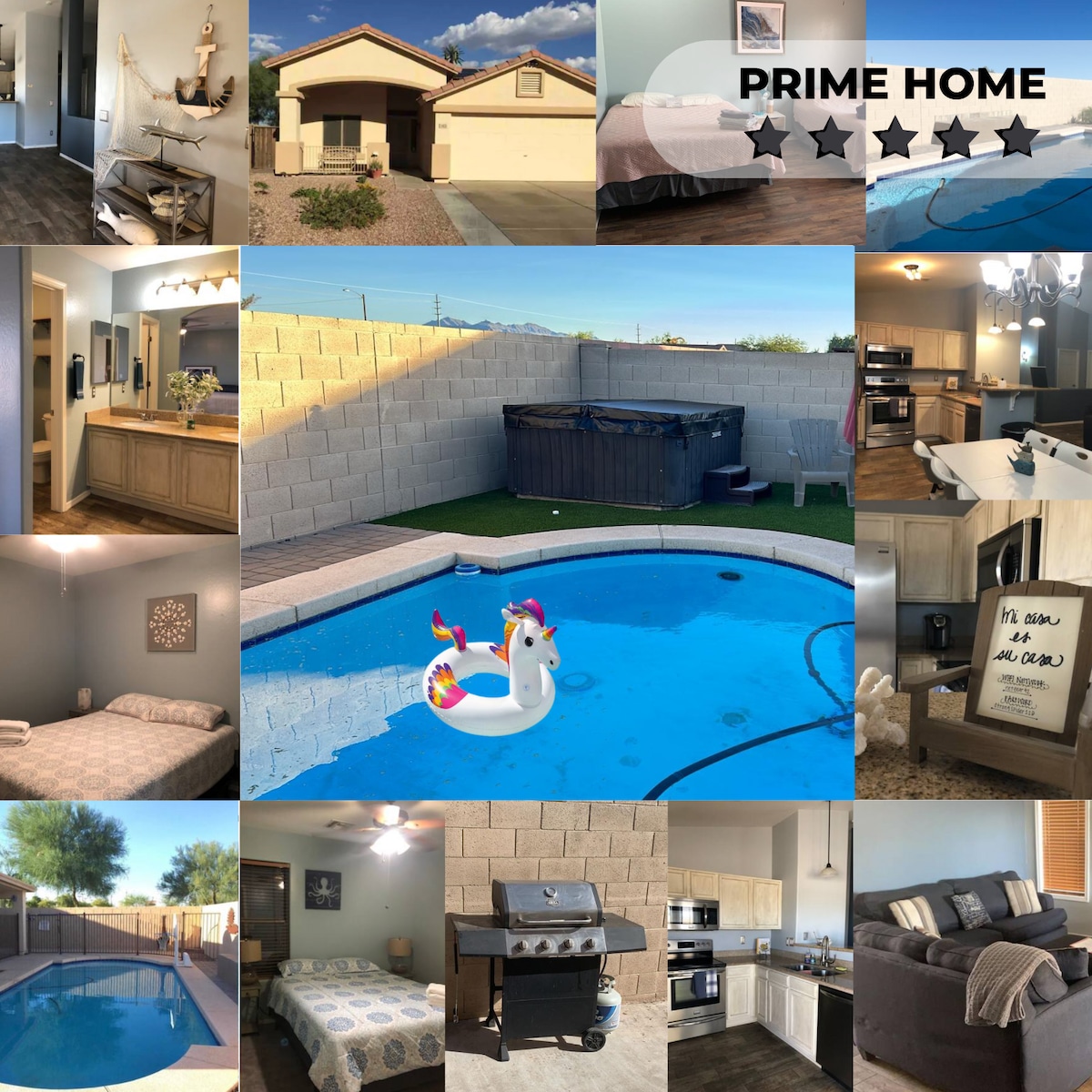 Ova kuća s 4 spavaće sobe i 2 kupatila nalazi se u Estrella Mountain Ranchu. Stražnje dvorište: hidromasažna kada za 5 osoba, 4tvs, Webber plinski roštilj, karakteristika vode, komplet za objedovanje i dovoljno dodatnog travnjaka. Dom je površine 2450 kvadratnih metara sa drvenim podovima, roletnama na plantaži, otvorenim dizajnom sa velikom velikom sobom, dnevnom sobom, kuhinjom i trpezarijom. Glavna spavaća soba ima kupatilo s dva umivaonika, kadom, zasebnim tušem, privatnim ormarom za vodu i velikim ormarom. 2 grijana bazena tipa odmarališta. Usklađenost svih lokalnih STR0000134