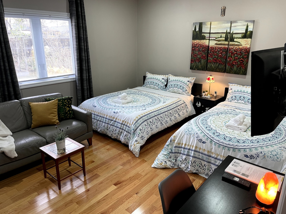 Uronite u luksuz i osjetite trenutni osjećaj spokoja i mira u ovom jedinstvenom studiju. Dizajnerski izgled s poboljšanim dekorima i završnom obradom. Pažljivo dizajnirano kupatilo - LED svjetla u ogledalu za šminkanje. Opremljen Boschevom mikrovalnom pećnicom, Nespressom, romantično udobnim Napoleonovim kaminom, pločom za kuhanje, mini frižiderom, priborom za jelo. Aerodrom 10, Toronto DT 30, Niagara 90, tržni centri i mnogi restorani na 2 minute vožnje. Sve je održavano u besprijekornom stanju i čeka na vaš dolazak. ZABRANJENO PUŠENJE/KUĆNI LJUBIMCI