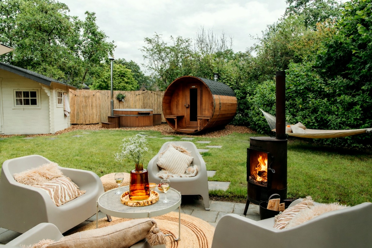 Sfeervol tuinhuis met houtkachel, sauna en hottub
