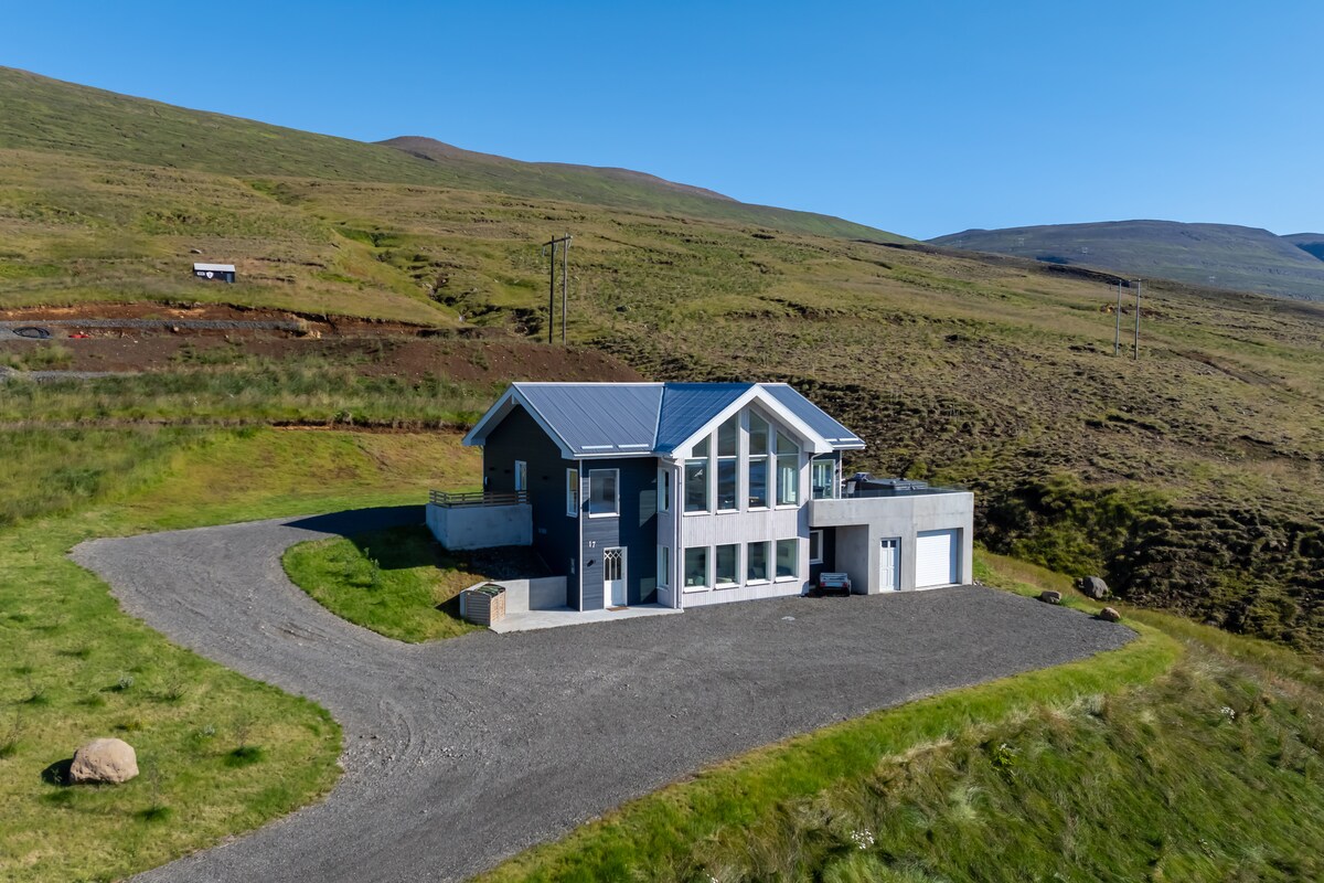 Ova moderna i privatna seoska kućica površine 106 m2 nalazi se odmah iznad Akureyrija i ima prekrasan pogled na grad i okolnu prirodu. Kuća ima potpuno opremljenu kuhinju, TV ravnog ekrana i Wi-Fi, zabavni sistem/društvene igre i udobnu unutrašnju hidromasažnu kadu u kojoj se možete opustiti nakon dugog dana.