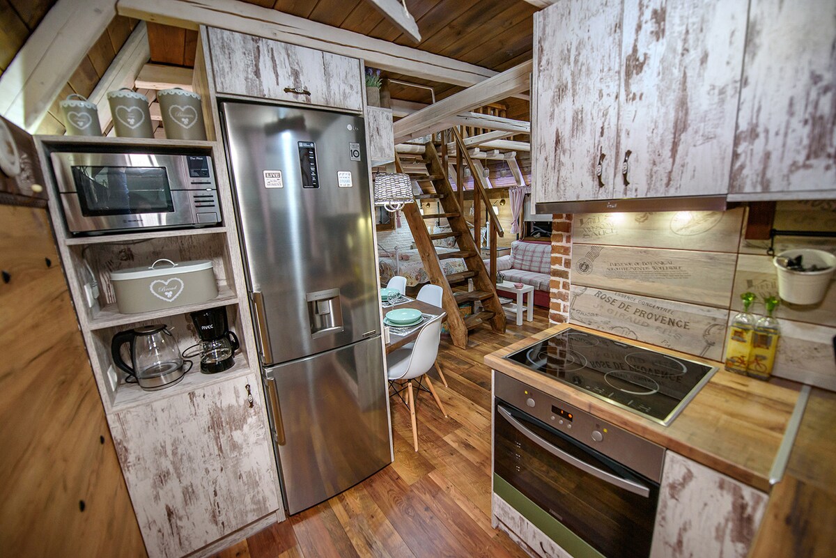 Drvena kuća od 45 m2 na ograđenoj površini od 2 hektara s ukrasnim drvećem i biljkama, vinograd, vrt s povrćem, velikim travnjacima i sjenicom s roštiljem. Stvorite uspomene u ovom jedinstvenom prostoru koji je pogodan za porodice s djecom ili za opuštanje s prijateljima daleko od zvukova grada. Vaši kućni ljubimci su također dobrodošli. Udaljenost od centra grada je 5 km, a od mlina vilenjaka 4 km.