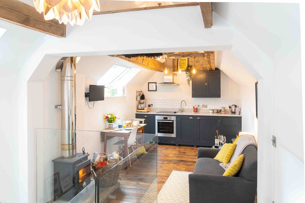 This romantic retreat is set in the heart of the picturesque village of Butterton which overlooks the beautiful Manifold Valley in the Peak District. The lanes are lined with pretty sandstone cottages and an idyllic ford runs through the cobbled street below the cottage and a great country pub is round the corner. This cosy hideaway is an ideal couples escape featuring a stunning bedroom with vaulted beamed ceiling and luxury features throughout. It has a boutique hotel feel in rural heaven.