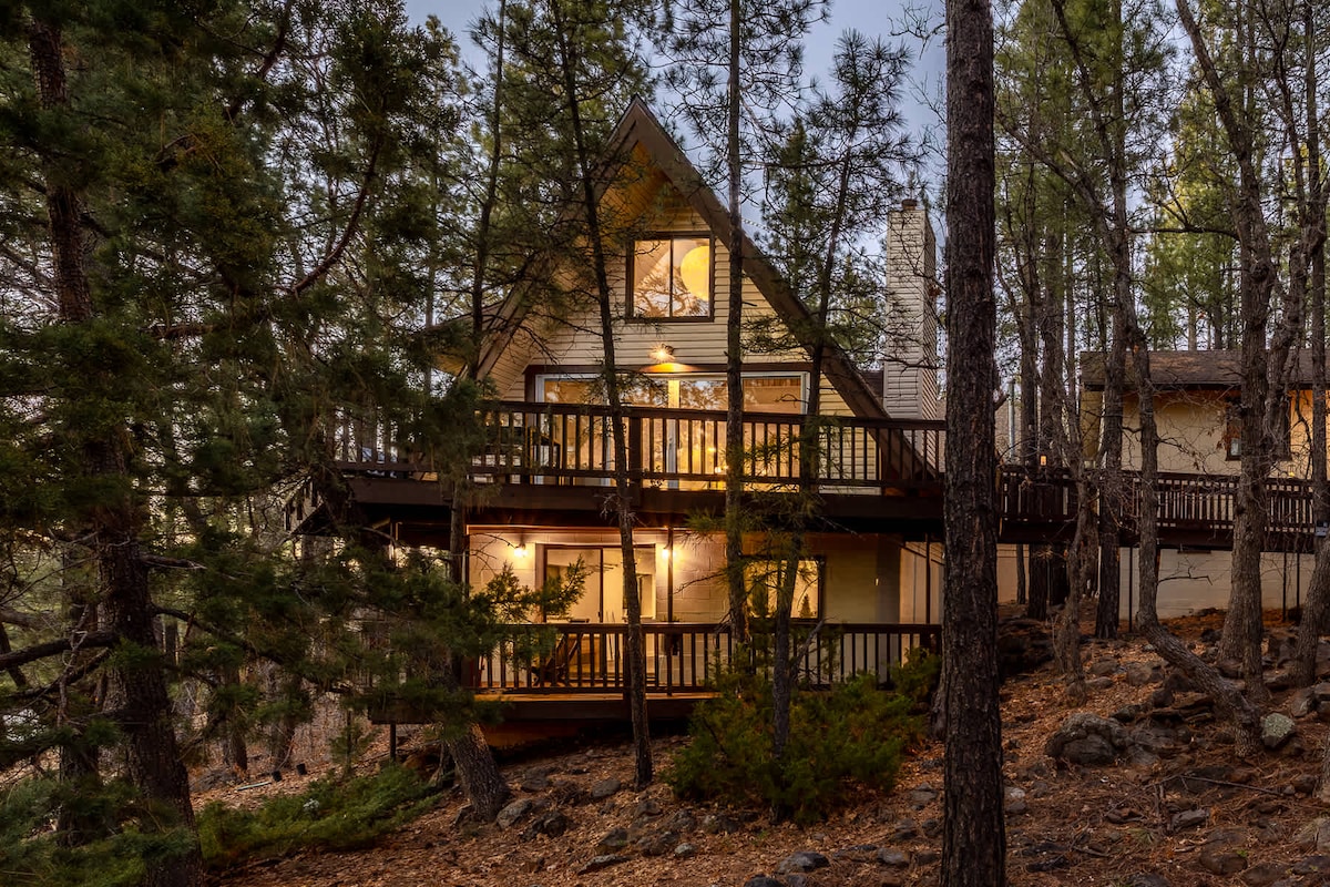Our beautiful, 3 level chalet cabin, is nestled between huge pine trees at the top of a cul-de-sac and features 5 decks, an outdoor dining space with a BBQ grill, and a jacuzzi tub with privacy screens. Inside you'll enjoy snuggling by the fireplace, flat screen TVs, free WIFI, board games, & a fully stocked kitchen. Our cabin has been recently updated with fresh carpet, paint, refrigerator, stove, and all new, modern furnishings. We are located right in the heart of magical Munds Park, AZ.