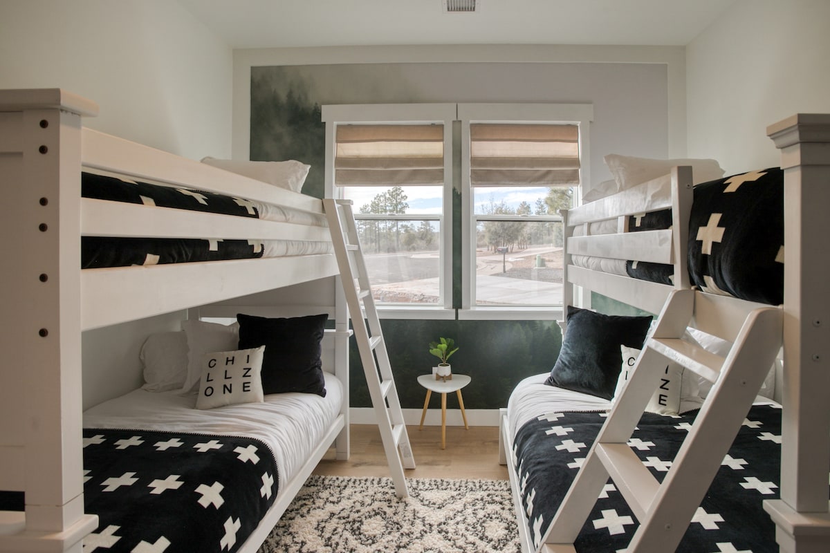 Relax at this boho cabin 5 min from lake, packed with comforts, surrounded by treed lots on all sides! Two luxe king bedrooms, each with a quiet work space and 14" king mattress. A 3rd room with toys, books, and 6 incredible built-in bunks with premium Beddys for snuggly sleep. Spacious great room, with cozy fireplace and dining area for 10+. Ample cook’s kitchen, with island and pantry including amenities of home. Plus garage game room--ping pong, foosball, & arcade basketball! Rest + recharge!
