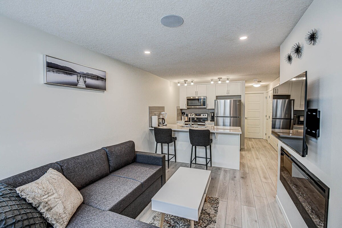 Modern 1BR Condo Near South Health Campus 🩺 🍳 Full Kitchen: stainless steel appliances, fully stocked 📺 Living: Smart TV + comfortable sectional 💻 Workspace: foldable desk 🌐 Internet: Telus Fiber high-speed Wi-Fi 🔒 Entry: self check-in with smart lock 🧺 Laundry: in-suite washer & dryer 🚗 Free parking(on-site) 📍 Mahogany • 🏥 South Health Campus (5 mins) • 🐎 Spruce Meadows (12 mins) Ideal for medical professionals, hospital visits, and business stays. Book now to secure your dates.