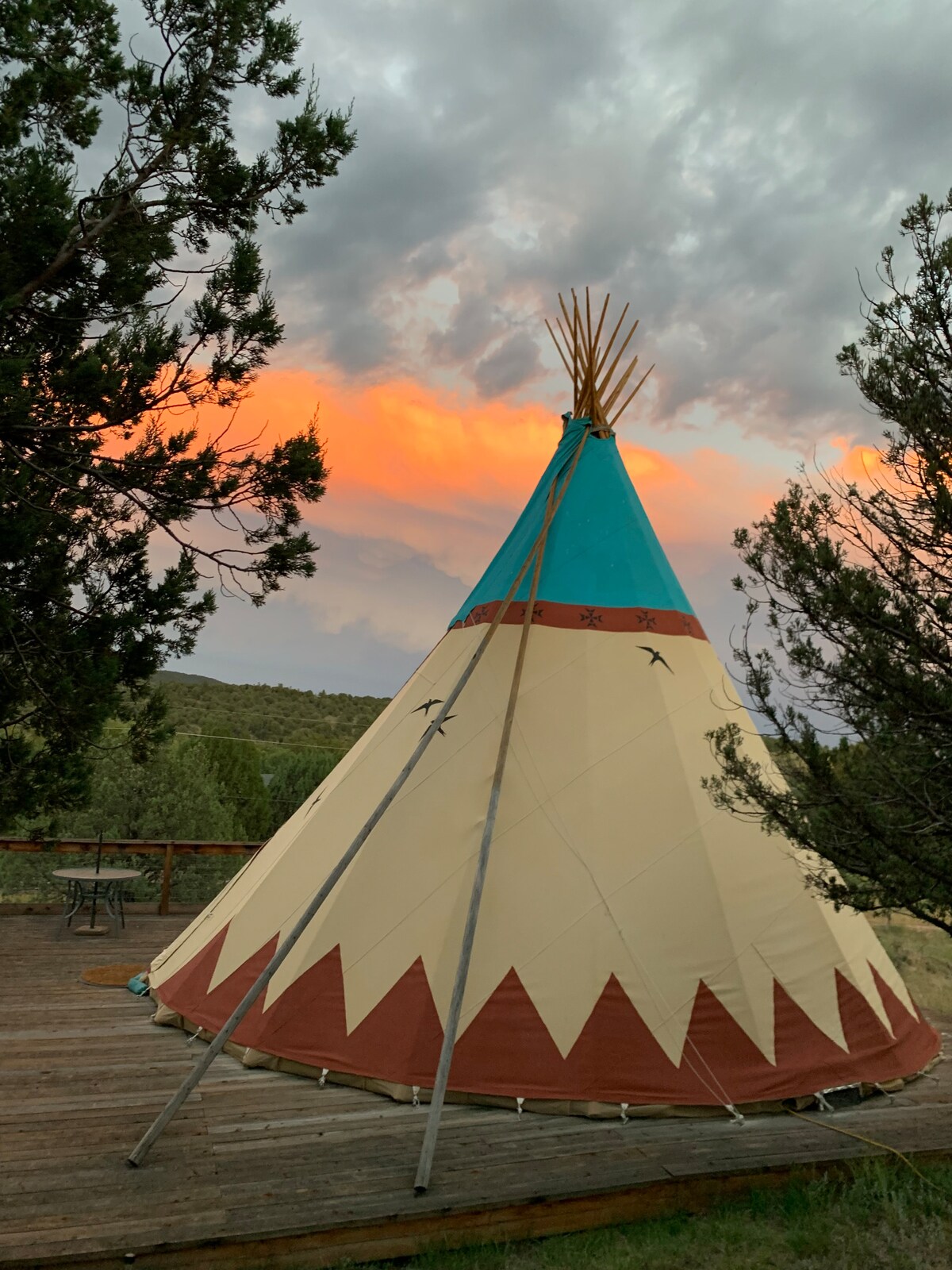 Beautiful fall/winter weather is here! Located on a hillside in the Tonto National Forest, this 24’ Tipi situated on a 30’ redwood deck, is luxury for the adventure driven. After a long day of hiking, hunting or off roading you’ll want a good nights sleep on a king size bed. Outdoor cooking area with water, toaster oven, air fryer and gas grill. Keurig and hot water kettle inside tipi. Two space heaters, bed warmers and a small fan. 50” TV, DVD player, CD/Bluetooth and turntable for music.