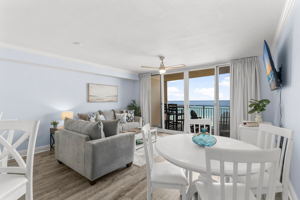 Ovaj kondominij na uglu na 7. spratu Tidewater Beach Resorta nudi prekrasan panoramski pogled na beskrajnu obalu smaragdne obale Meksičkog zaljeva. S privatnog balkona ili udobnosti kauča ili trpezarijskog stola u dnevnoj sobi, uživajte u zadivljujućim zalascima sunca iznad okeana i blistavim gradskim svjetlima noću. Odmaralište se može pohvaliti nevjerovatnim sadržajima, uključujući dva bazena u stilu lagune, grijani unutrašnji bazen, masažne kade, najmoderniji fitness centar s rimskim spa centrom, bioskopom i privatnim pristupom plaži.