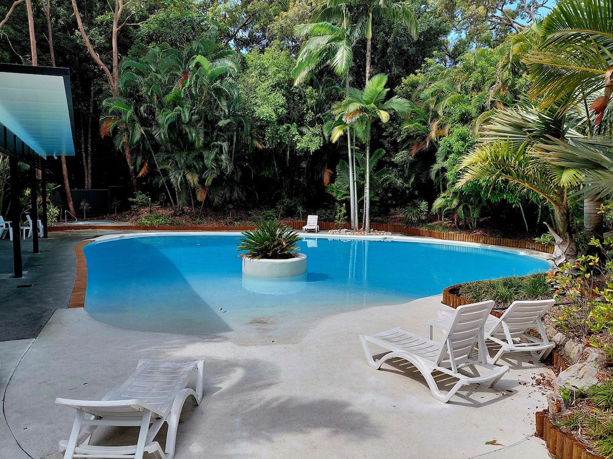 Opustite se u ovom mirnom, opuštenom prostoru sa svim modernim pogodnostima, kao što su samostalni dolazak, klima-uređaj, mašina za pranje suđa, mašina za pranje/sušenje veša, 2 televizora, Wi-Fi, mikrovalna pećnica itd. Jedinica se nalazi u odmaralištu Rainbow Shores koje ima masažnu kadu, dva bazena i teniski teren. Do plaže vas dijeli kratka šetnja kroz šumsku stazu. Ako volite avanturu, možete istražiti obližnje ostrvo Fraser ili 4wd duž plaže do Double Island Pointa. Rainbow Beach ima mnogo odličnih restorana, od kojih neki imaju odličan pogled na okean.