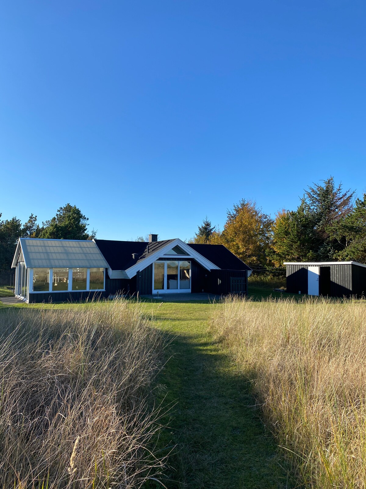 Unikt, skandinavisk sommerhus fra 2023. Huset er smukt integreret i naturen. Beliggende i lyng og egekrat. I hjertet af fantastiske Nordjylland. Tæt på Vesterhavet. Tæt på Kattegat. Tæt på Råbjerg Mile. Gåafstand til golfbane ca. 1. km. Og kun 18 km. til Skagen. Bo midt i naturen og oplev ro og velvære. Mærk den afslappende komfort ved at være omgivet af enkel skønhed. Huset ligger perfekt for terrasseliv og naturoplevelser: MTB, golf, vindsurfing, badeliv, shopping- og restaurantbesøg i Skagen.