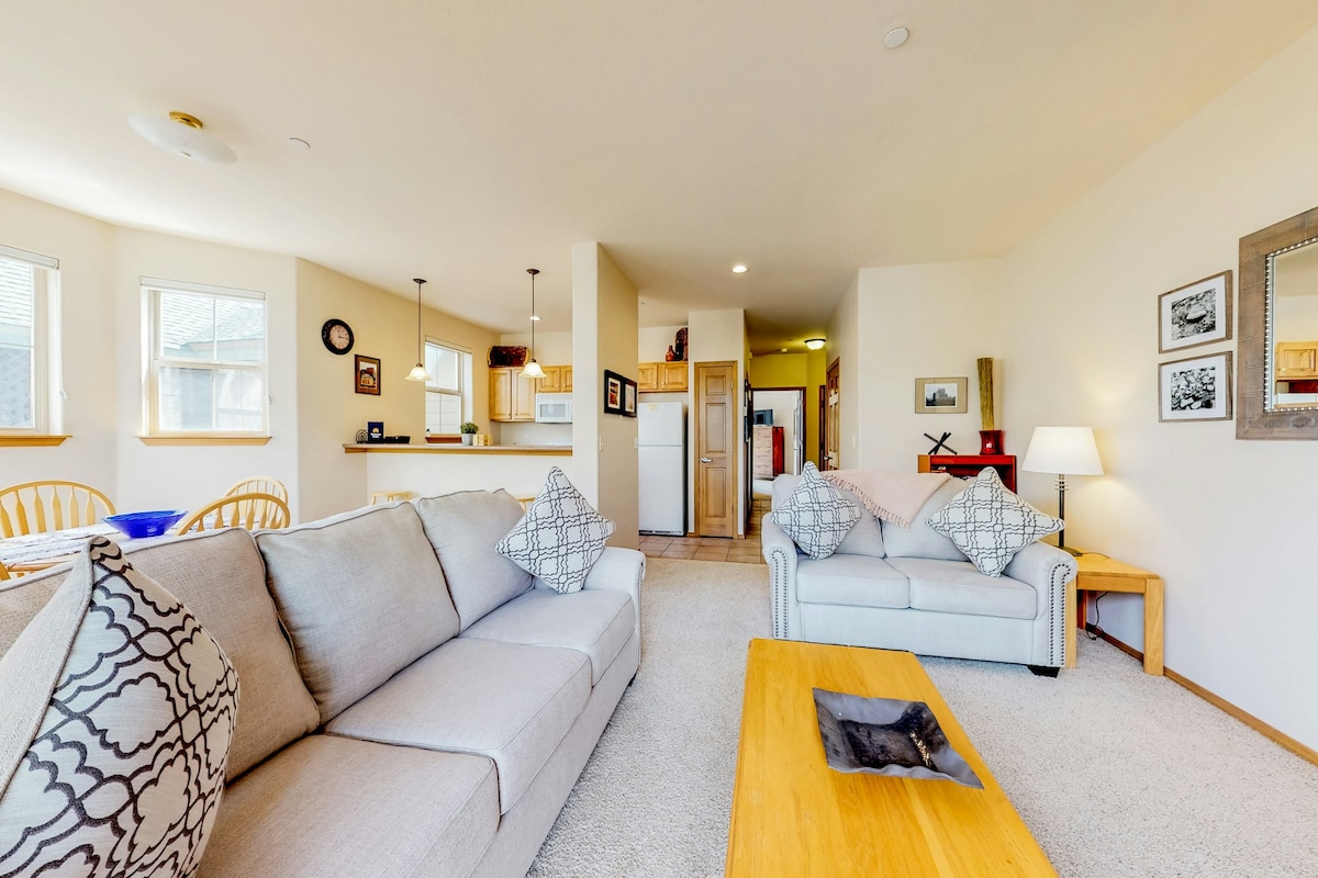 Free covered parking & high-speed internet. 890 sq ft condo w/private balcony overlooking Tenmile Creek & nestled into Mt. Royal. Enjoy a fully equipped kitchen, gas fireplace, balcony, Netflix/smart TV. Bus stops directly out front & drops you at Copper Mnt in 7 min! Centrally located near multiple world-class ski resorts (Vail, Breck, Keystone etc) Tenmile Creek & bike/rec path steps away. Walk to Main St. for shopping & dining. Rent a boat, paddle board at Lake Dillon (.7miles).