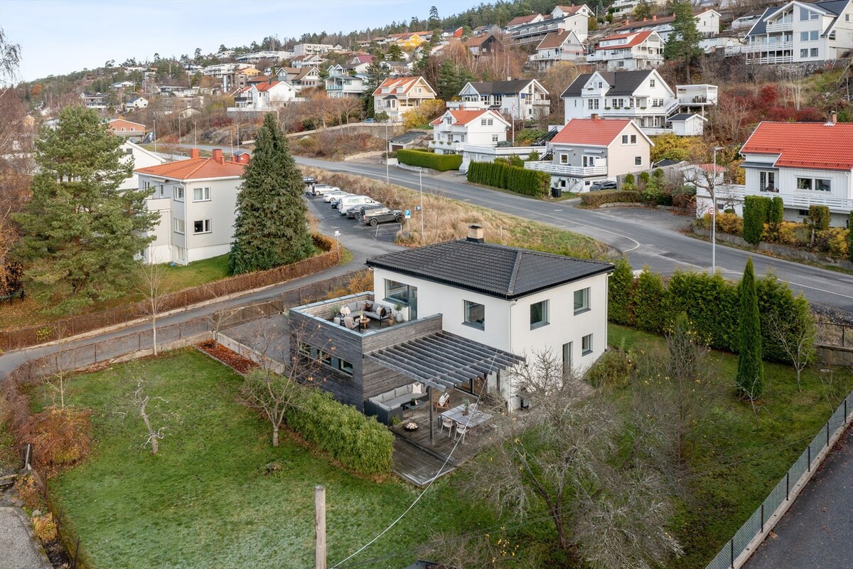Prostrana moderna novouređena kuća od oko 320 m2, smještena u centru ljetnog grada Drøbaka. Kuća se sastoji od tri sprata s četiri spavaće sobe, tri kupatila, tri dnevne sobe, sobe za aktivnosti, poslovnog prostora. Veliki i svijetli glavni sprat s nekoliko prostora za sjedenje i iznutra i izvana, balkonom i terasom s nepunim vrtom. Mirno i prijateljsko područje s fudbalskim terenom kao najbližim komšijom. 15 minuta hoda do grada Drøbak, akvarijumeta i plivačkog parka. Neposredna blizina prodavnica, vodenog parka Bølgen i terena za golf.