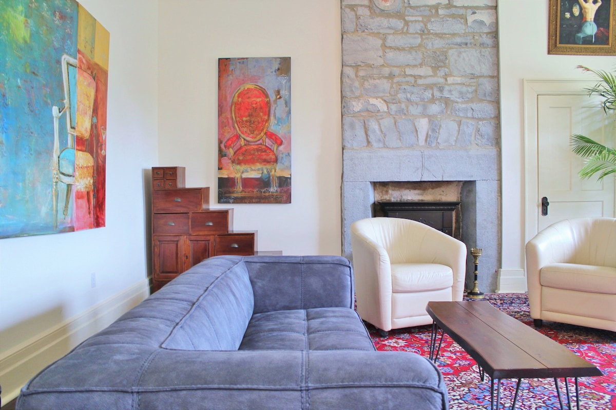 Potpuno renoviran glavni sprat kuće, 5 minuta od historijskog centra Kingstona! Potpuno opskrbljena kuhinja otvorenog koncepta s grijanim podom. Tuš kabina s padavinama u kupatilu, također s grijanim podom. Zidovi spavaće sobe su zvučno izolirani. Stražnja terasa je ograđena kako bi se osigurala potpuna privatnost. Masažna kada je otvorena tokom cijele godine. Tu je 1 veliki bračni krevet, 2 bračna kreveta, 1 kauč na razvlačenje i 2 jednostruka sklopiva madraca na podu. Parking na prilazu za 4 automobila ili 3 velika vozila, sa punjačem za električna vozila nivoa 2