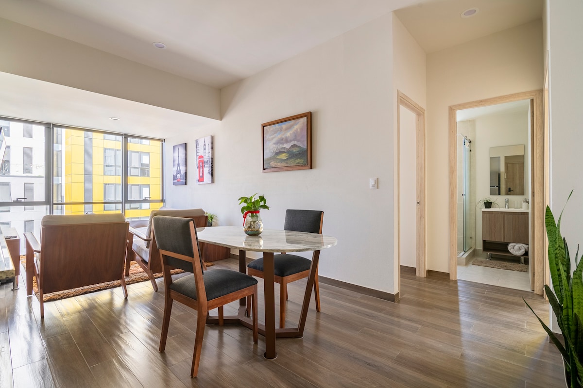 Neka sve bude jednostavno u ovom mirnom smještaju koji se nalazi u centru grada. Prekrasan stan 20 minuta od AIFA-e, sa sadržajima, privilegovanim pogledom, tihim i vrlo udobnim. Unutar kompleksa možete imati pristup prostorima kao što su bazen, igre, restorani, tenis, teretana itd. Također imate pristup trgu istog kompleksa na kojem ćete pronaći bilo koju prodavnicu koju tražite, kao što su bankomati, kino i supermarket.