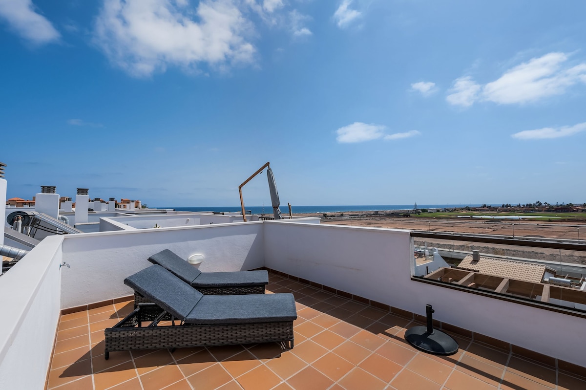 Ekskluzivni penthouse Sunrise Suite nudi fantastičan pogled na zaljev Corralejo s prostrane privatne krovne terase. Nalazi se u nedavno dovršenoj modernoj zgradi (2023.) s karakterom potkrovlja u Corraleju na sjeveru Fuerteventure. Do svih većih prodavnica, apoteka i brojnih restorana, kao i plaža, možete doći za nekoliko koraka. Brza svjetlovodna Wi-Fi mreža vam omogućava da radite na daljinu ili da se opustite surfajući. Vaš odmor može početi!
