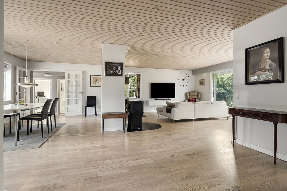 1950's spacious home overlooking Vaserne, a natural resort, and Furesøen. Family-friendly area for bikers, walkers and nature enthusiasts. Only 10 km to the sea, 18 km to the centre of Copenhagen, and 2 km to go for a swim in the lake. The house (180m2) is Nordic in style and genre with tributes to DK 1950's architecture and furniture. Four bedrooms, two livingrooms, two bathrooms and a kitchen. Basement w. washing machine and dry cleaner. Garden w. BBQ and trampoline. Garage with EV charger.