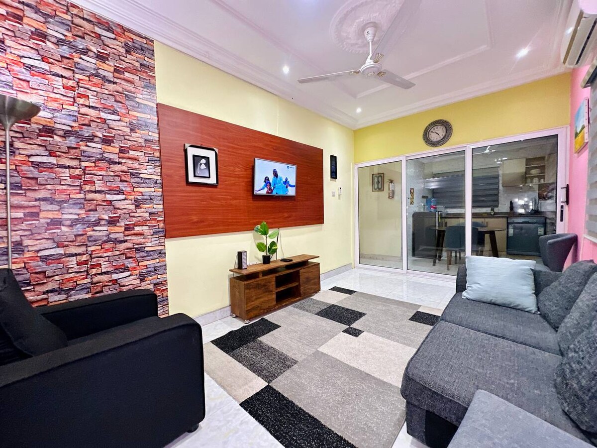 Opustite se s cijelom porodicom u ovom mirnom smještaju. Potpuno namješten za samostalno posluživanje hrane DSTV +Wi-Fi +Smart TV Ima generator u pripravnosti u slučaju nestanka struje. Potpuno klimatizovano Električne kapije Prostrani parking Električna sigurnosna ograda. Lijepa zelena trava. Osoba zadužena za njegu u pripravnosti U blizini teretane i drugih sadržaja, uključujući trgovački centar Palace Papaya i KFC. Također 15 minuta do glavnog tržnog centra Accra.