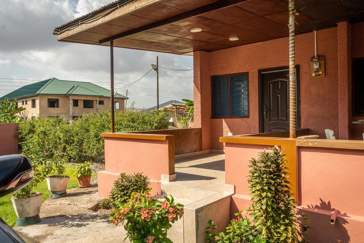 Opustite se u ovom mirnom utočištu uz osvježavajući planinski zrak, samo 10 minuta hoda od trgovačkog centra Oyarifa u kojem se nalaze kino, restorani i supermarket. Uživajte u miru i svježem povjetarcu, nudeći savršen odmor dok ste još uvijek blizu svih osnovnih potrepština. Osim toga, odmorite se jer smo otporni na dumsor! Smještaj je opremljen pouzdanom rezervnom energijom kako biste se osjećali ugodno tokom nestanka struje.