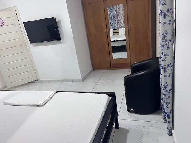 Enjoy a comfortable stay in this private ensuite room on the 3rd floor of a gated property in Ofankor Barrier, Accra. There are no shared living spaces—your bedroom and bathroom is fully private. The room features air-conditioning, fast Wi-Fi, TV, a standing fan, fridge, and a hot shower for your comfort. The area is safe and guest-friendly, close to the Ofankor Police Station, public transport, shopping, and main roads, and about 30 minutes from the airport. Ideal for business or leisure stays