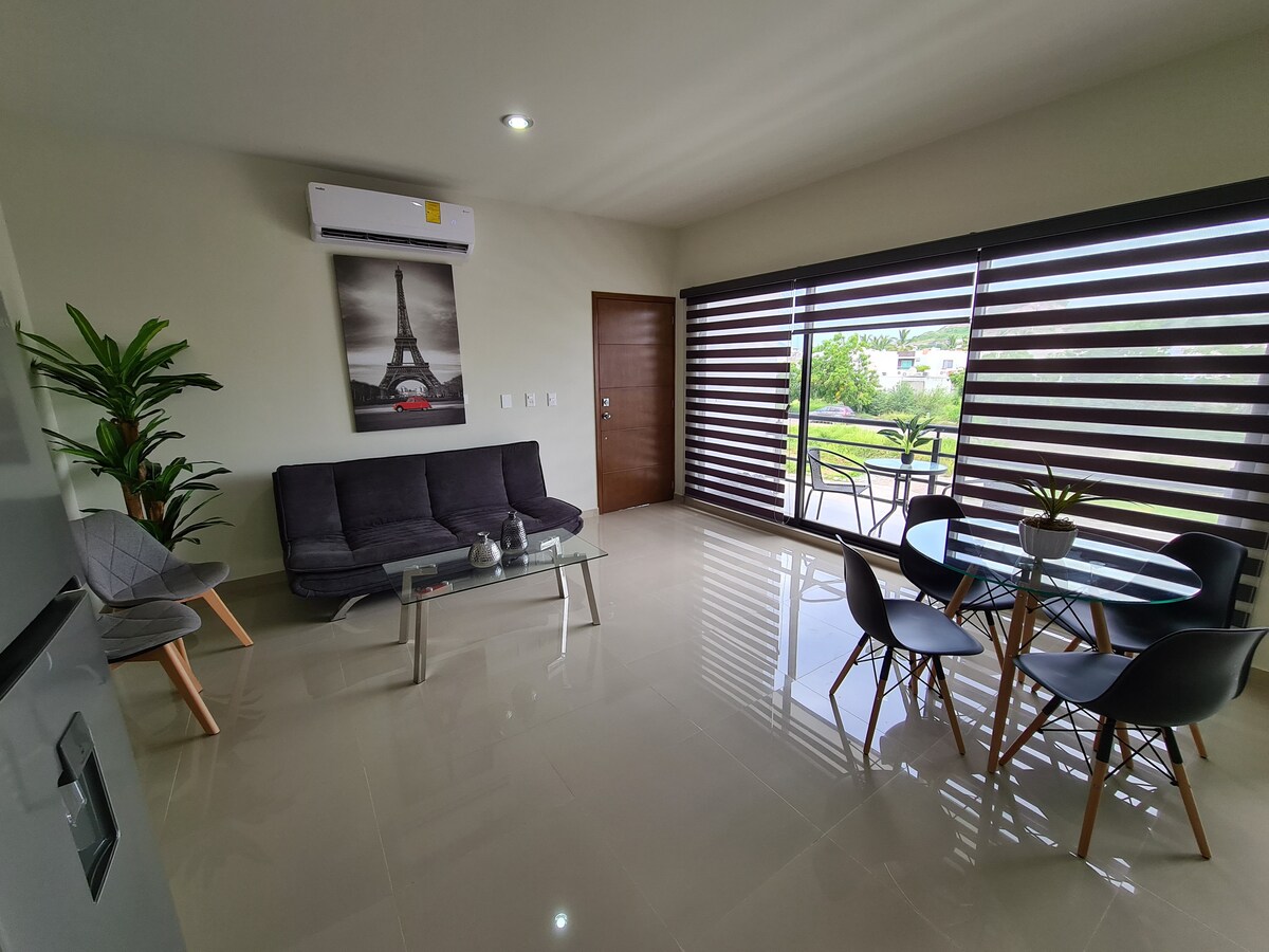 Dobrodošli u Marinu Campo de Golf! ⛳✨ Smješten u ekskluzivnom i privatnom kompleksu u jednom od najnovijih područja Mazatlána, naš smještaj nudi udoban i dobro dizajniran prostor, idealan za porodice ili parove. S balkona ćete uživati u pogledu na teren za golf i spektakularne zalaske sunca. Plaža Punta Sábalo udaljena je samo 5 km, a supermarketi i tržni centri su udaljeni manje od 2,5 km. Preporučujemo putovanje automobilom ili korištenje taksija/Ubera.