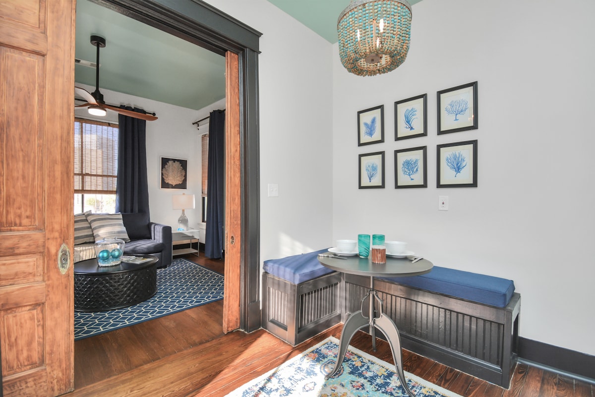 Dobro došli u Sail La Víe! Ovo je stan s 1 bračnim krevetom i 1 kupatilom koji se nalazi u obnovljenoj viktorijanskoj kući (ukupno 3 jedinice) u historijskom okrugu East End u Galvestonu. Sa temom francuske četvrti, stan je pogodan za pse (1 pas do 25 funta) i samo nekoliko koraka udaljen od centra Galvestona! Ako ne želite jesti u jednom od brojnih restorana u neposrednoj blizini, možete si pripremiti obrok u kompletnoj kuhinji ili roštiljati vani na gurmanskom Vikinškom roštilju.