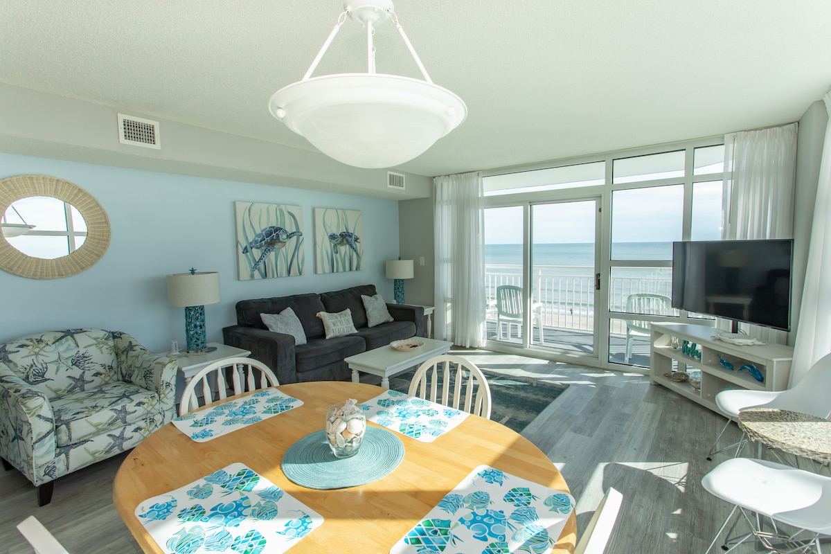 🌊 Bijeg na obalu okeana | Novo renovirano 2025. Probudite se uz zvuk talasa i panoramski pogled na Atlantik s privatnog balkona! Ovaj moderan, elegantan stan s dvije spavaće sobe u srcu Myrtle Beacha ima moderan dekor, drvene podove, kauč na razvlačenje i vrhunske madrace. Uživajte u kompletnoj kuhinji, mašini za pranje/sušenje veša i sadržajima odmarališta: unutrašnji/vanjski bazeni, jacuzzi, umjetna rijeka i dječja zona za prskanje. Nekoliko koraka od zabavnog parka Family Kingdom, šetališta i pristaništa 2nd Ave, čeka vas savršen odmor na obali!