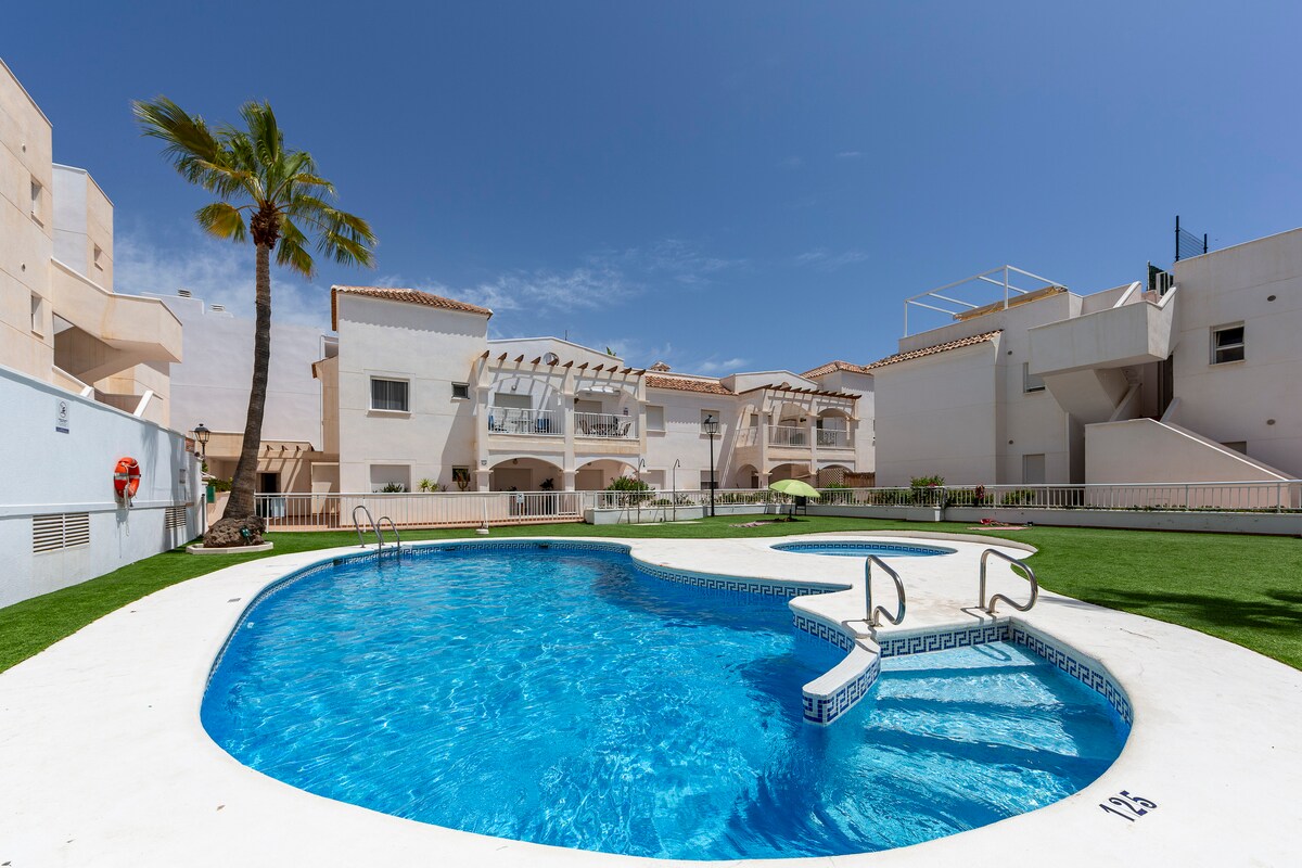 APARTAMENTO CON VISTAS Muy luminoso, con preciosas y relajantes vistas. Está totalmente equipado, con una bonita decoración. terraza con toldos. El apartamento está en un residencial tranquilo y cuidado, perfecto para poder descansar. La playa está a 10 minutos andando . Garrucha está muy cerca Es Ideal para los amantes del golf; de la Naturaleza en estado puro por la cercanía de nuestro maravilloso "Parque Natural Cabo de Gata". Ideal también para estancias largas y Teletrabajar.m