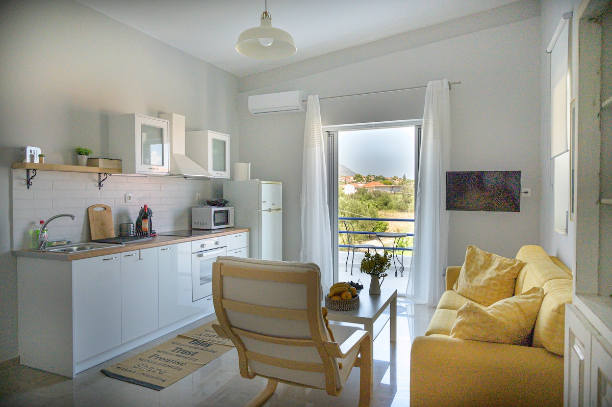 Šarmantni svježe renovirani studio s potpuno opremljenom kuhinjom i klima uređajem čeka goste. Samo 300 metara od mora, nalazi se na 2. spratu mirne zgrade s besplatnim javnim parkingom na ulicama u blizini. Savršeno za vas ako planirate odmor na plaži ljeti, ali i planinske šetnje u selima Trikala, posjetite skijalište Ziria zimi ili istražujete tematski park Area Synest.