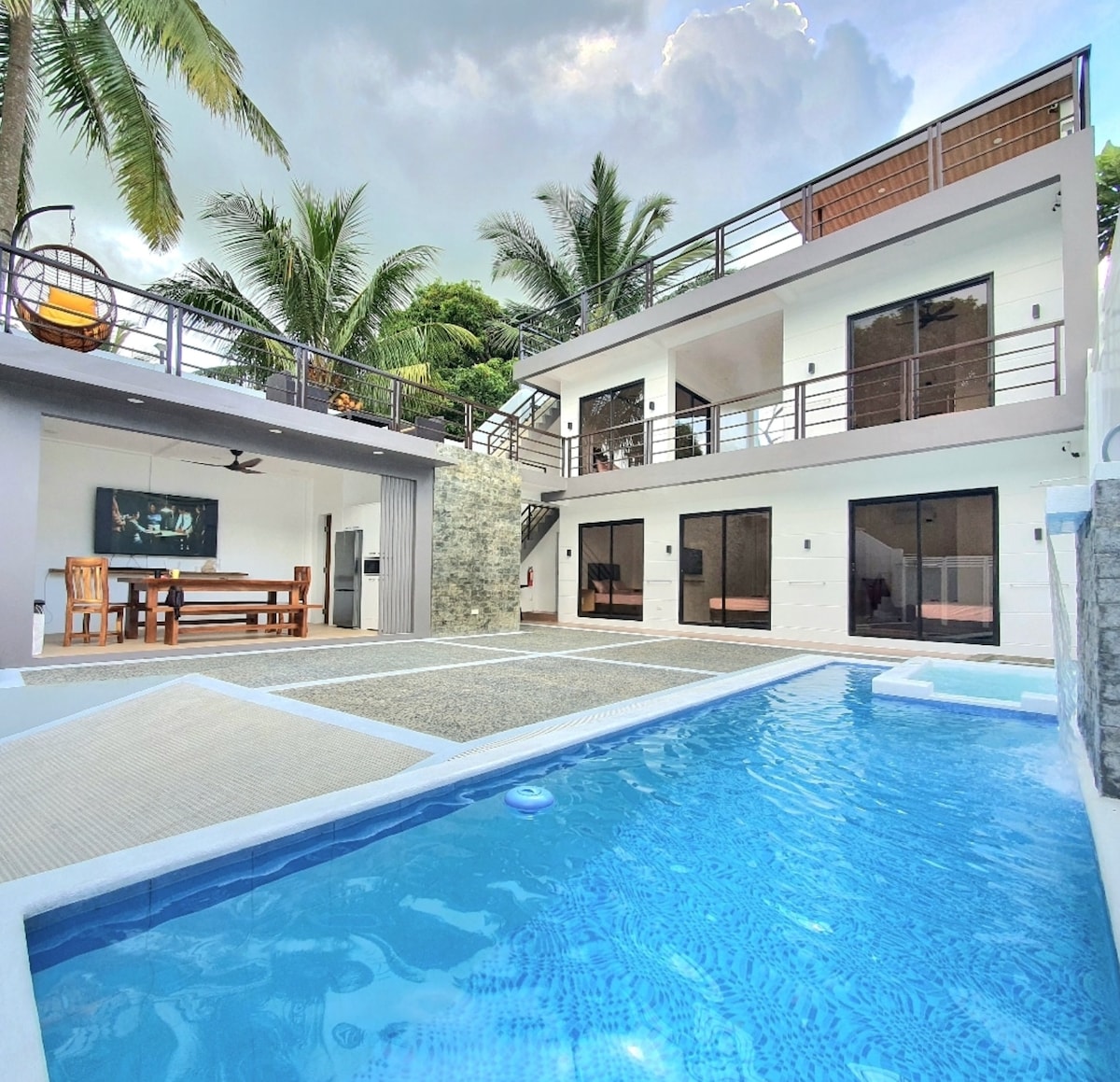 Dobro došli u The Penthouse Nuvali, vaše vrhunsko utočište za odmor! Ovaj udoban smještaj u potkrovlju sadrži sve što vam je potrebno za opuštanje i zabavu: • Privatni jacuzzi za opuštanje pod zvijezdama • Postavljanje kina na otvorenom s projektorom za epske filmske večeri • Potpuno opremljena kuhinja za domaće obroke • Brojač šanka • Brzi Wi-Fi, TV i prostran moderan dizajn s bujnim vještačkim travnatim detaljima • Igre: pikado, poker i šah • 30 minuta Tagaytay • Začarano kraljevstvo u trajanju od 20 minuta