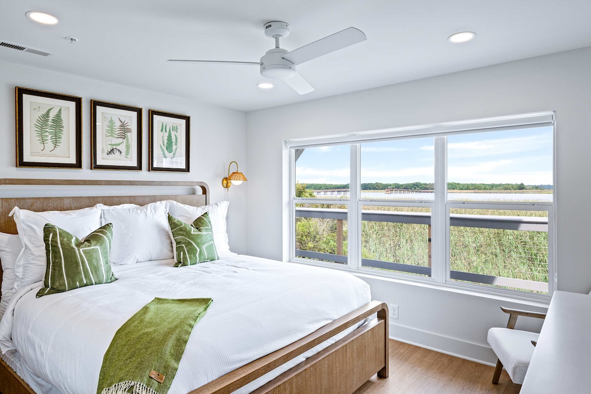 Winyah Bay Club features 17 stylish, individual cottage units, each ideal for large wedding parties, golf enthusiasts, and families. This cottage offers 2 spacious bedrooms (the master has breathtaking water views) and 2.5 baths. The open-plan living room, kitchen, and dining area on the second floor are designed to maximize the stunning waterfront vistas, making every stay memorable and luxurious.