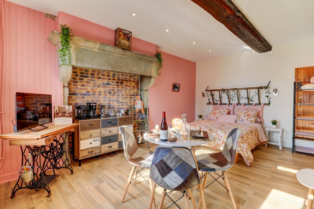 Nezavisna gîte za 4 osobe u velikoj privatnoj bašti od 1300 m2. WI-FI veza. Pristup za osobe s invaliditetom, velika tuš kabina. Veliki dnevni boravak s opremljenom kuhinjom (frižider / zamrzivač, rerna, mikrovalna pećnica, raclette ...). Vrtni namještaj i zatvoreno sklonište za bicikle ili motocikle Dnevni boravak je zatvoren zavjesom sa sofom na razvlačenje (dobra posteljina) Spavaća soba sa dovoljno prostora za odlaganje. Obezbijeđena je kućna posteljina i organski proizvodi. Prostorija za tuširanje - mašina za pranje veša, pegla i daska za peglanje, usisivač metle.