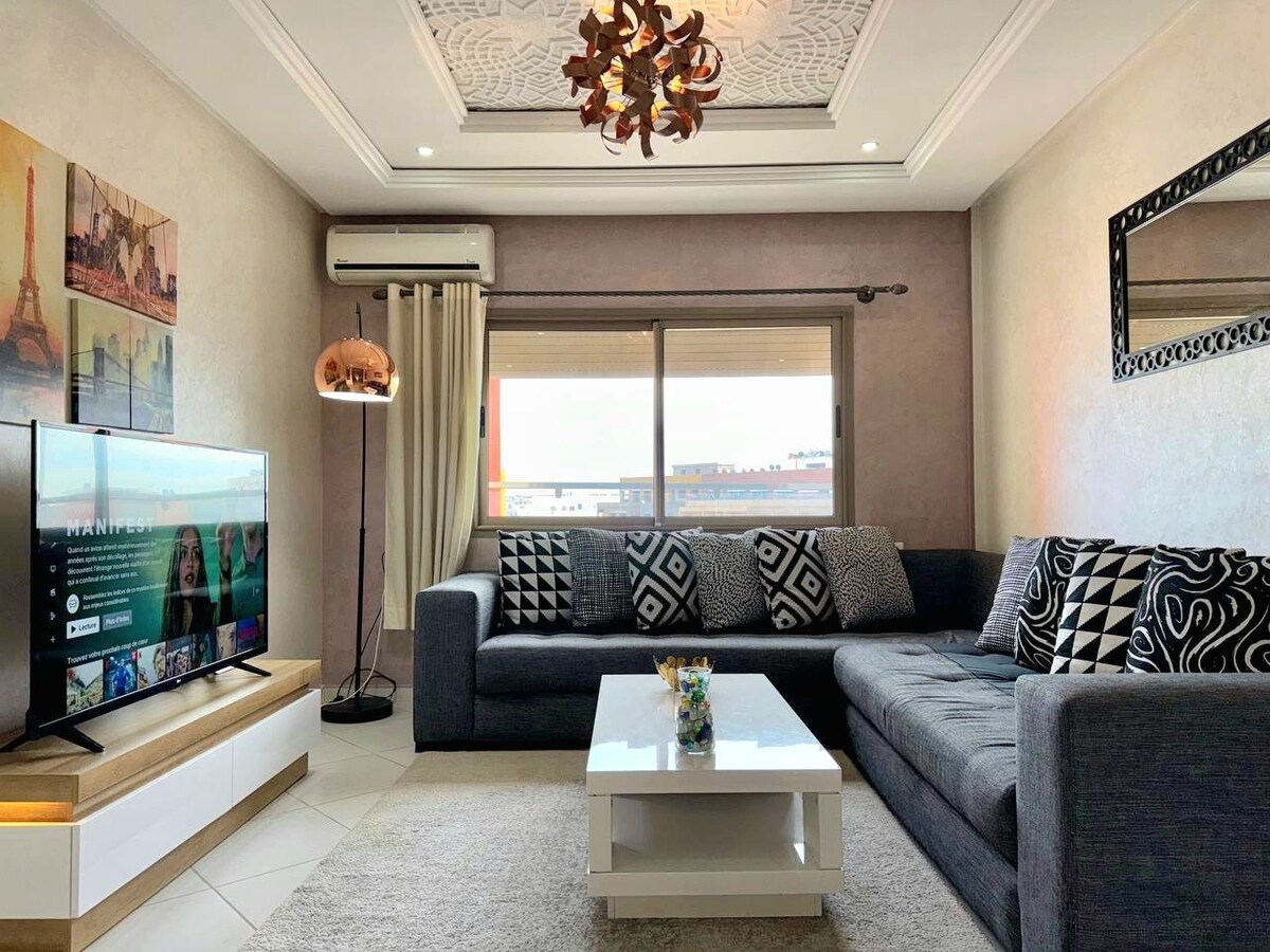Dobro došli u svoju modernu oazu u srcu Kenitre! Svijetli stan od 75 m² s udobnim dnevnim boravkom, pametnim TV-om i Netflixom, 2 udobne spavaće sobe, opremljena kuhinja i 2 moderna kupatila. Veliki balkon s visećom ljuljaškom za vaše trenutke opuštanja. Pogodno smješten: 5 minuta hoda do stanice TGV, u blizini trgovačkog centra Kenitra, pekare, kafića i restorana odmah u podnožju zgrade.