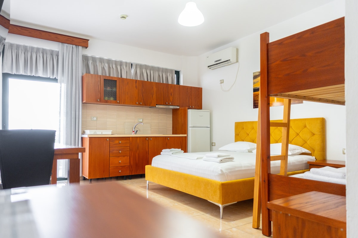 Smještaj koji oduzima dah u brdima Sarande 🇦🇱 Pogled na more i mir Pobjegnite u naše mirne apartmane na brežuljku u prekrasnoj Sarandi u Albaniji. Smještene iznad grada, naše moderne jedinice nude zadivljujući panoramski pogled na Jonsko more, ostrvo Krf i bujno zeleno okruženje. Svaki stan je potpuno namješten s privatnim balkonom, klima uređajem, potpuno opremljenom kuhinjom i brzim Wi-Fi mrežom. Uživajte u najboljem od oba svijeta, na samo nekoliko minuta vožnje od plaže i centra grada.