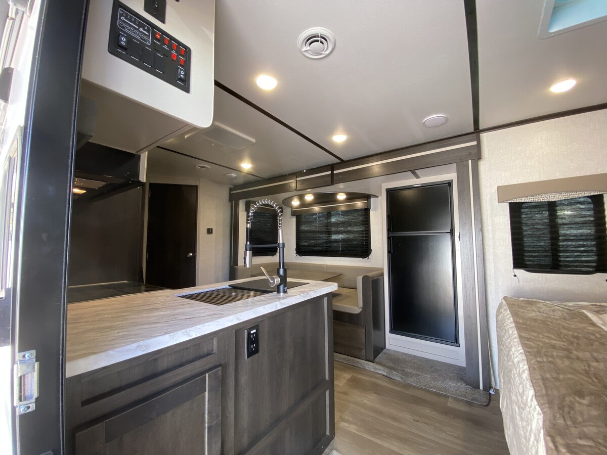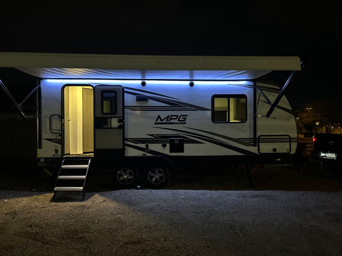 * Upravo su instalirana dva nova minijaturna klima-uređaja. Održava prostor hladnim i tihim. Udoban kamper ili glamper! 384 kvadratnih stopa luksuzno izgrađenog RV.m by Grand Design. Urbano kampovanje u North Phoenixu, Arizona. Odlična lokacija. Jedna spavaća soba s bračnim krevetom. I jedan kauč na kojem možete spavati s naslonjačima. Također može biti dostupno za dostavu na vašu lokaciju ili u kamp.