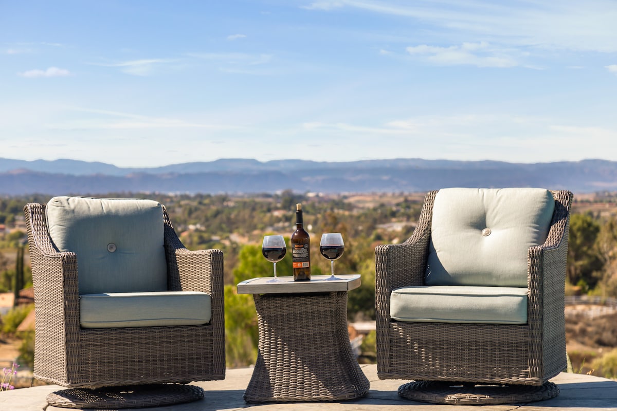 Uživajte u mirnom i tihom spokoju s pogledom na vinsku zemlju doline Temecula u svojoj luksuznoj privatnoj vili s udobnim bračnim krevetom, potpuno opremljenom kuhinjom, privatnim natkrivenim dvorištem i neometanim pogledom na zemlju vina i lokalne planinske lance. Nalazi se u Glen Oaks Hillsu, samo dvije minute vožnje od vinske staze De Portola i u roku od 5 do 10 minuta od više od 40 vinarije. Manje od 10 minuta vožnje do CRC-a, Galway Downsa i Green Acresa i 15 minuta do Starog grada.