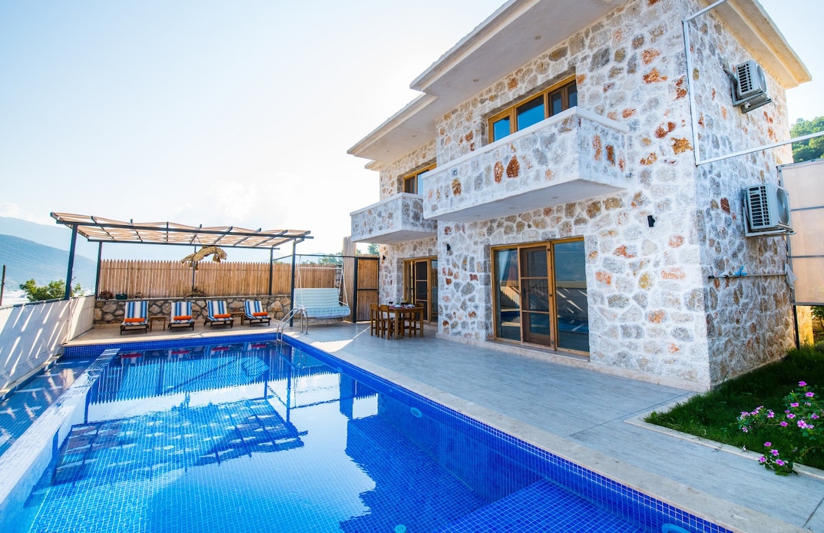 Nalazi se u regiji Sarıbelen u Kalkanu. Imamo luksuznu kamenu vilu s 2 spavaće sobe i privatnim bazenom za 4 osobe. Oko 20 minuta vožnje 15 km do centra Kalkana i plaža 15 km. Naša vila, koja se nalazi u području s mnogo vila, ima veličanstven pogled na prirodu i veliki zeleni vrt. U sklopu objekta se nalazi masažna kada. Zaštićen je sistemom zavjesa za konzervativne porodice.