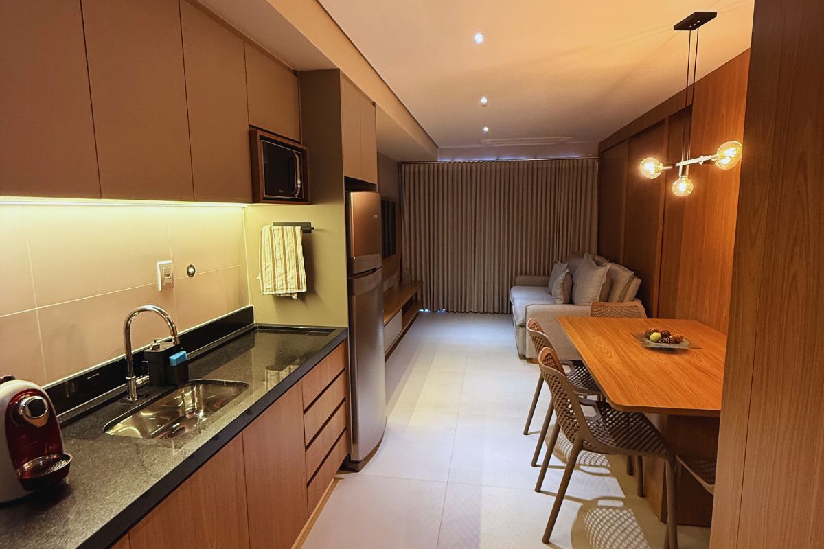 Apto 45 m2. Quarto:Cama Queen,armários,bancada escritório,TV 4K 50”,ar-cond.,roupa de cama/banho. Sala: sofá cama,TV 4K 50”,ar-cond.,mesa e 4 cadeiras design italiano. Cozinha:armários,bancada,cooktop 4 bocas,geladeira,forno elétrico,forno microonda,cafeteira elétrica,filtro água,sanduicheira, panelas,utensílios. Piscina borda infinita, hidro,sauna,academia,brinquedoteca,salão festa,espaços gourmet. 1 vaga garagem. Portaria 24 horas porteiro e segurança. Temos outro apto