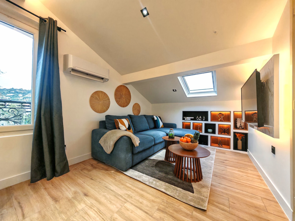 Mnogo prostora i svjetla, interijer u boemskom stilu s daškom moderne umjetnosti. Pogled unutar 180 stepeni je bez daha i vodi vas u daleke horizonte. West le CAP d'ANTIBES, East les ILES DE LERINS. Odmah iznad stare luke i restorana s jahtama, krstarenje i pristanište. 2 prekrasne plaže u 300 et 600m udaljenosti. pješice. centar grada i stanica za 5 min pješice, zračna luka Nice za 30 min autobusom ili vlakom . Uživajte!