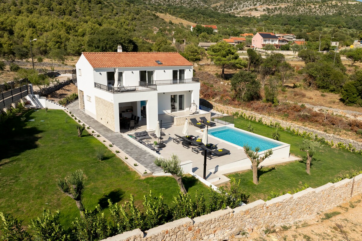 Prekrasna vila za odmor s privatnim grijanim bazenom s hidromasažom u blizini Nacionalnog parka Krka. U mirnom okruženju s pogledom na mauzolej Ivana Meštrovića. Sastoji se od tri spavaće sobe s bračnim krevetima za 6 osoba, kuhinje s dnevnom sobom, kupatila i WC-a. Kuća je u potpunosti opremljena svime što vam je potrebno za život. Ispred kuće nalazi se terasa za sunčanje s bazenom i kaminom, a navečer je stol i stolice za objedovanje uz potpunu privatnost. Iza kuće je parking za 4 vozila