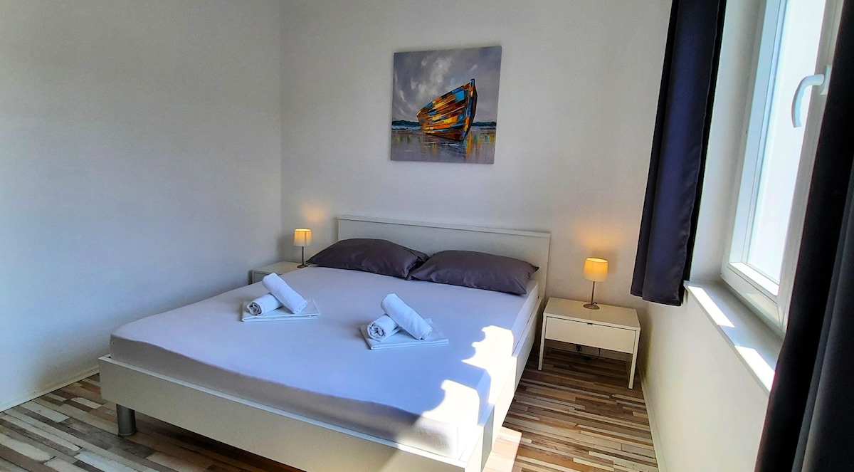 Apartman za četiri osobe ima dvije spavaće sobe, jedno kupatilo, kuhinju i balkon sa pogledom na more. Apartman se nalazi u našoj obiteljskoj kući, samo 15 minuta lagane šetnje do centra grada. Poznata plaža Zrće udaljena je 15 minuta vožnje automobilom (22km), a Zadar 45 minuta vožnje automobilom (50km). U cijenu uključeno privatno parkiralište, klima uređaj, posteljina, peškiri, neograničen WiFi, SAT/TV, naknada za čišćenje i lokalna boravišna taksa.