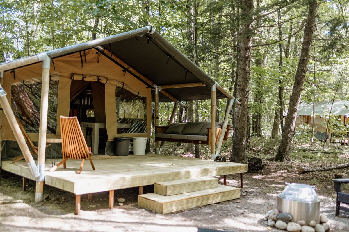 Uživajte u zvukovima prirode dok boravite u ovom jedinstvenom smještaju. Naš glamping šator je opremljen udobnim bračnim krevetom, bračnim krevetom i svom posteljinom. Savršeno za boravke prijatelja ili porodice. Vaše privatno mjesto s roštiljem na ugalj i ognjištem. Posjetite zajednički prostor za goste u Basecamp Lodgeu. Tu su 2 kupatila, kompletna kuhinja, TV, WI-FI, radni prostor, suvenirnica za pregled naših prilagođenih dasaka za rezanje, majice i nevjerovatni javorov sirup! Ponesite cipele za planinarenje i istražite naše staze :)