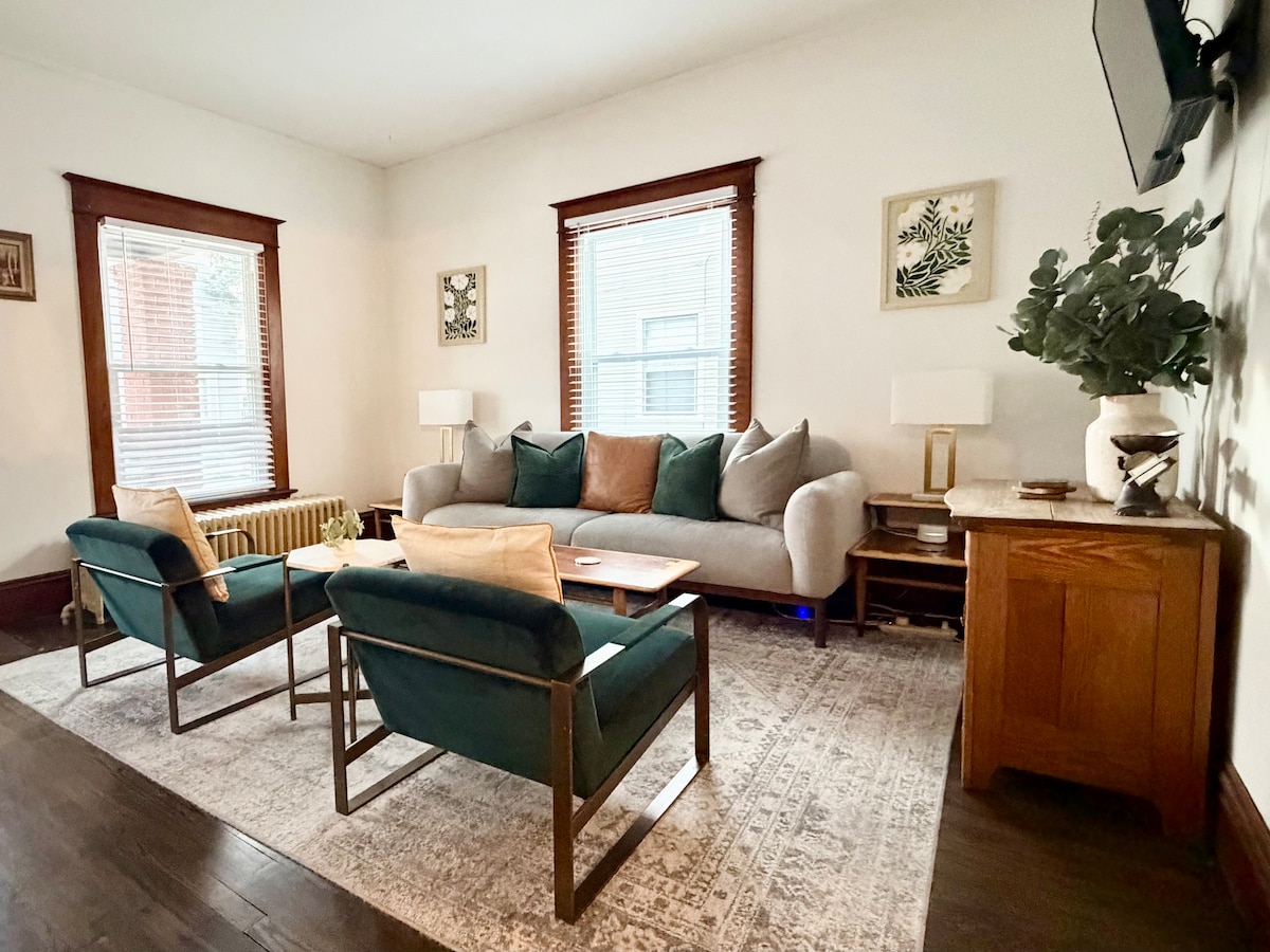 Apartment 1 is the lower unit of a charming two-unit home, offering a cozy stay with historic character. Enjoy original hardwood floors, beautiful woodwork, & built-in cabinets in the dining room & kitchen. A large dining table is perfect for meals or work. Relax with radiant heat, blackout blinds, ample closet hanging space, & 680-thread-count sheets. Bedroom 1 features an original pocket door. Each unit has its own private entrance; please note the upper unit may be occupied during your stay.
