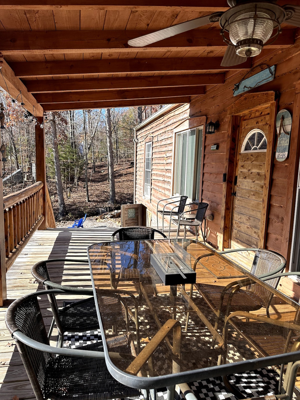 Meemac Manor, has a central courtyard/firepit flanked by 2 Bldgs both bldgs are included. Barndo 1 is 3 BR, primary w/king bed, loft w/single hide-a-bed & desk, fully eqpd. kitchen, 2 full baths, great room w/glass garage door to deck, grill & Blackstone. Barndo 2, has large BR w/king bed & full bath, a celebration room w/karaoke stage, costumes, 4 mics, piano, TV, VIP balcony, kitchenette, air hockey, ping pong, PacMan, dart board, & deck with hot tub. 84' of covered porches w/rocking chairs.